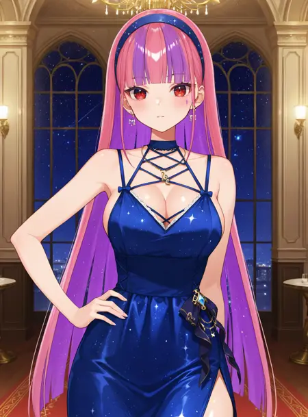 choker, pendant, strapless layered dress, waist bow, sleeveless, arm tattoo, open jacket, thigh tattoo,또는