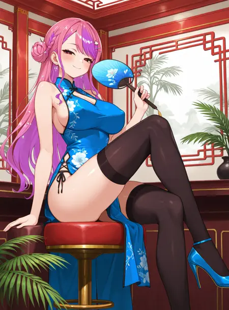 long hair, single side bun, facial mark,또는