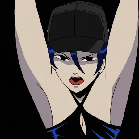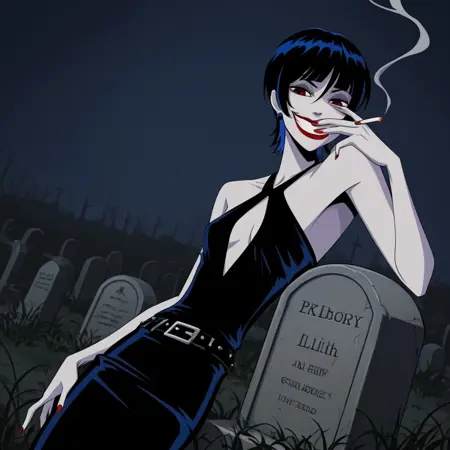 Lilith, 1girl, solo, pale skin, short straight black spiky hair with spiky bangs, red lips, short tight black sleeveless dress, plunging neckline with thin straps, wide belt with rectangular buckle, bluish highlights on clothing, black heels, small dark earrings