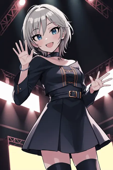 Recommended outfits1girl, grey hair, short hair, blue eyes, medium breasts, dress, hair ornament