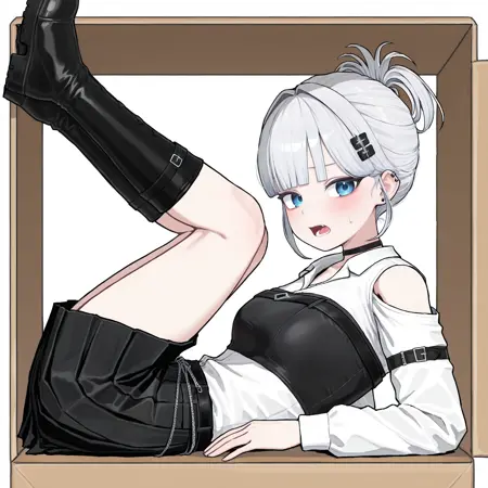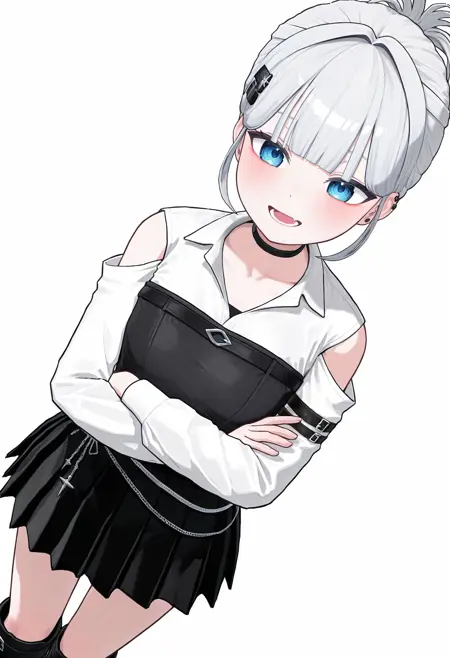 스타게이저(스타게이저 뉴세구): STARGSG, 흰 머리카락, 평평한 앞머리, 뒤로 묶은 머리, 짧은 머리, 옆머리, 검은 헤어클립, 머리 뒤로 묶은 단발, 머리 끝부분, 파란 눈, 귀걸이, 검은 초커, 흰 셔츠, 칼라 있는 셔츠, 검은 튜브 탑, 어깨 절개, 팔 벨트, 노출된 어깨, 긴 소매, 검은 스커트, 주름 스커트, 체인 벨트, 검은 부츠, 무릎 부츠,