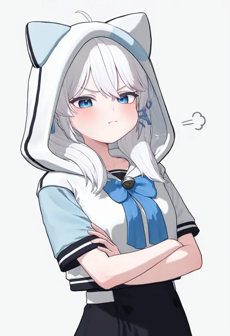 후드 착용 변형(후드 쓴 단명트윈테일 뉴세구): HDGSG, 흰 머리카락, 눈 사이의 머리카락, 어깨까지 내려오는 머리카락, 중간 길이 머리, 트윈테일, 아호게, 파란 리본, 머리 리본, 파란색 헤어핀, 파란 눈, 흰 셔츠, 해적 칼라, 길이 짧은 후드티, 다채로운 후드티, 고양이 후드, 짧은 소매, 어긋난 소매, 파란 소매, 파란 리본 넥타이, 진동 종, 검은 치마, 허리 높은 치마, 소매 없는 치마, 흰 벨트, 짧은 치마, 흰 무릎 길이 양말, 흰 스니커즈, 후드 위로 올림