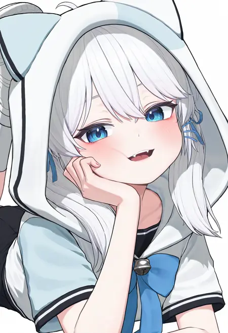 트윈테일 변형(트윈테일 뉴세구): TTGSG, 흰 머리카락, 긴 머리카락, 트윈테일, 아호게, 파란 리본, 머리 리본, 눈 사이의 머리카락, 파란색 헤어핀, 파란 눈, 흰 셔츠, 해적 칼라, 길이 짧은 후드티, 다채로운 후드티, 고양이 후드, 짧은 소매, 어긋난 소매, 파란 소매, 파란 리본 넥타이, 진동 종, 검은 치마, 허리 높은 치마, 소매 없는 치마, 흰 벨트, 짧은 치마, 흰 무릎 길이 양말, 흰 스니커즈, 후드 아래로 내려옴
