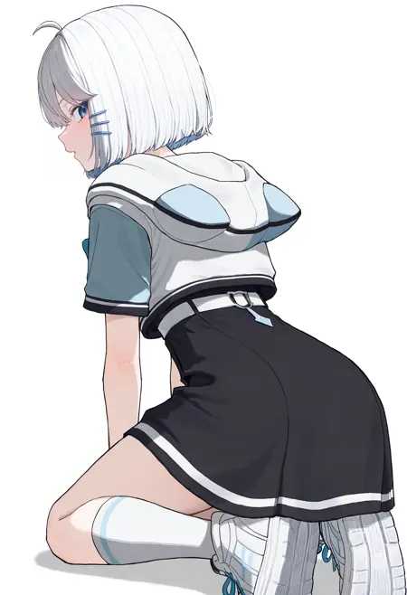 NEWSEGU/basic(뉴세구/basic): 뉴세구, 흰 머리카락, 눈 사이의 머리카락, 짧은 머리, 밥컷, 아호게, 파란색 헤어핀, 파란 눈, 흰 셔츠, 해적 칼라, 길이 짧은 후드티, 다채로운 후드티, 고양이 후드, 후드 아래로 내려옴, 짧은 소매, 어긋난 소매, 파란 소매, 파란 리본 넥타이, 진동 종, 검은 치마, 허리 높은 치마, 소매 없는 치마, 흰 벨트, 짧은 치마, 흰 무릎 길이 양말, 흰 스니커즈,