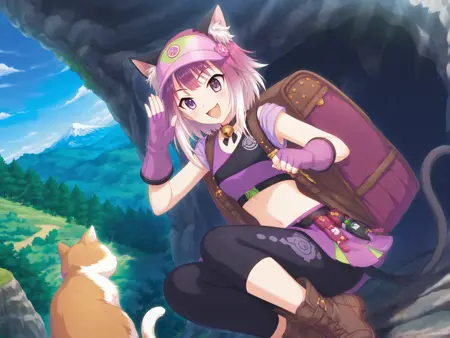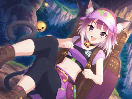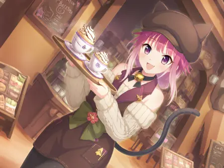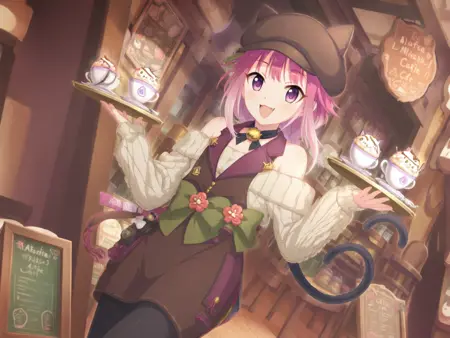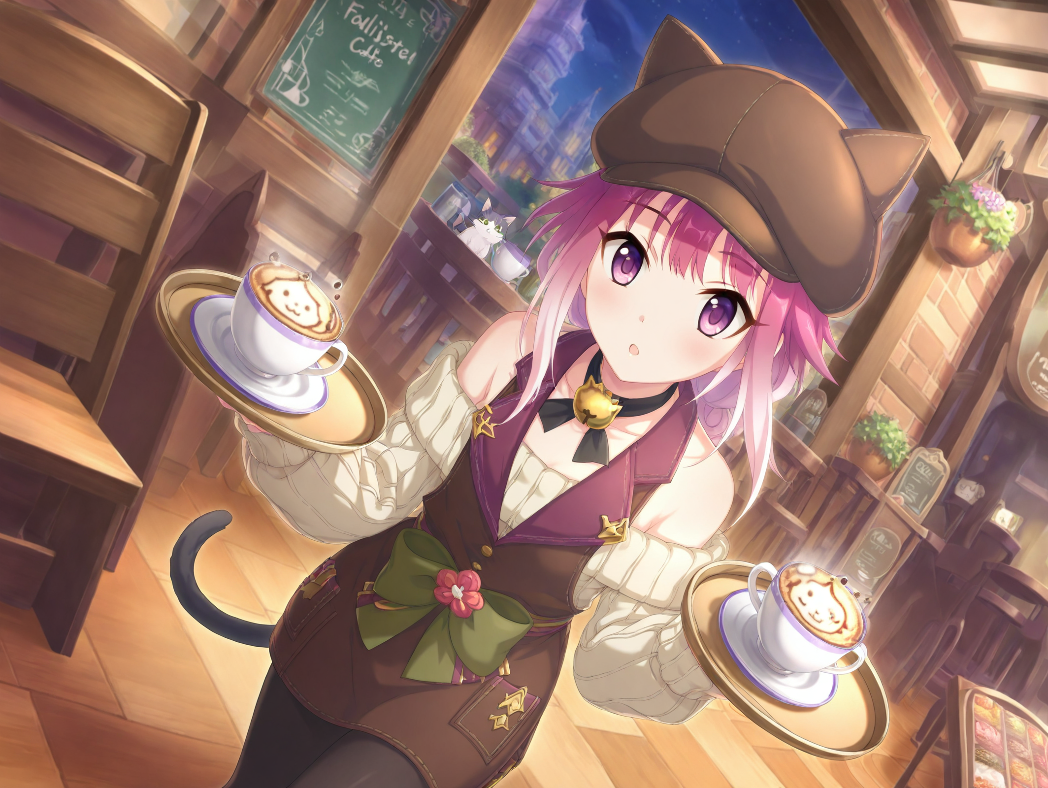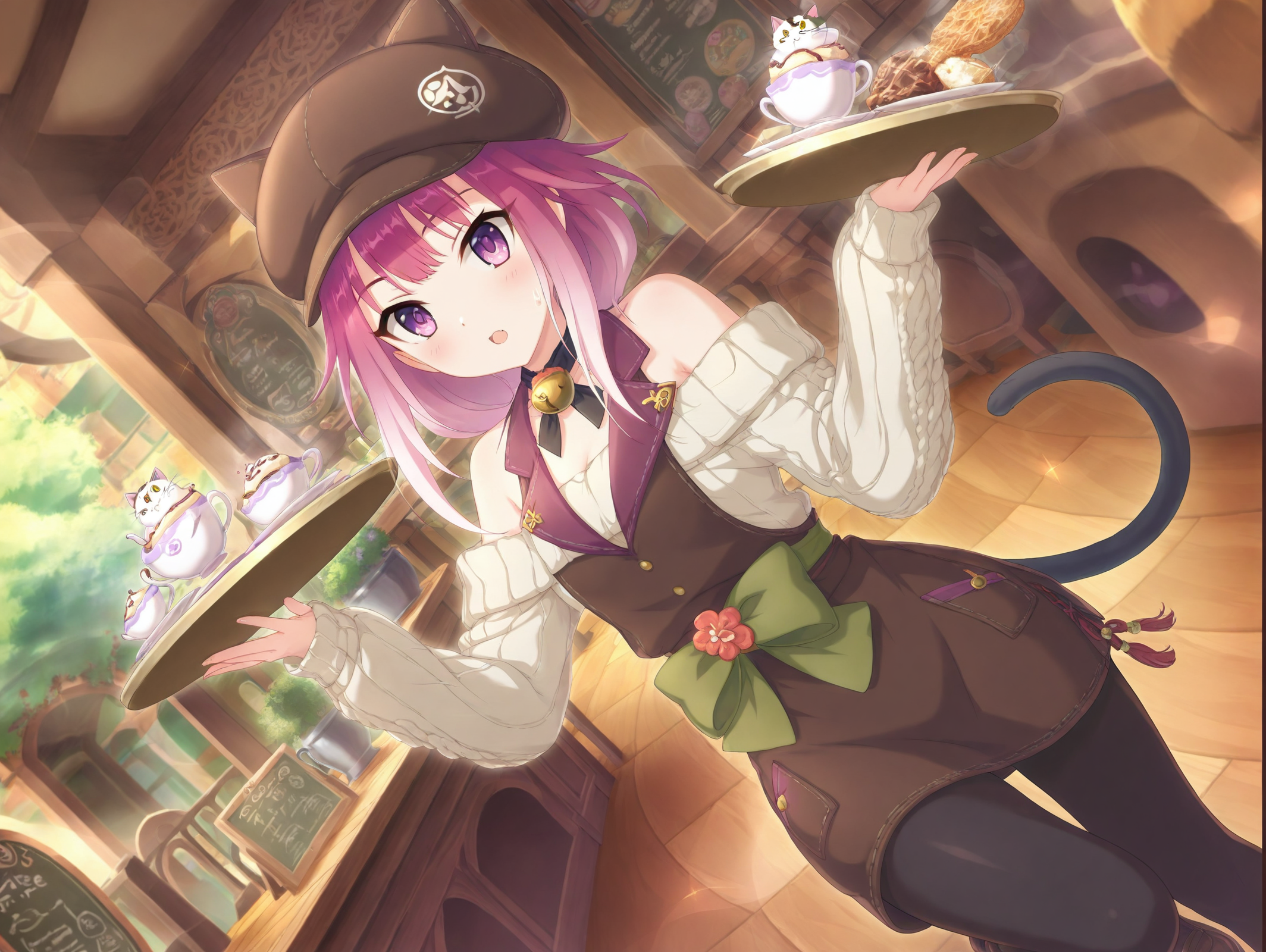 absurdres, official style, more details, lora:Tamaki5464:1, 1girl, solo, tray, tail, sweater, purple eyes, holding tray, cat hat, pantyhose, holding, cat tail, cup, pink hair, cat ears, purple hair, hat with ears, black pantyhose, ribbed sweater, food, bare shoulders, sleeves past wrists, cafe, fall, frighten,
