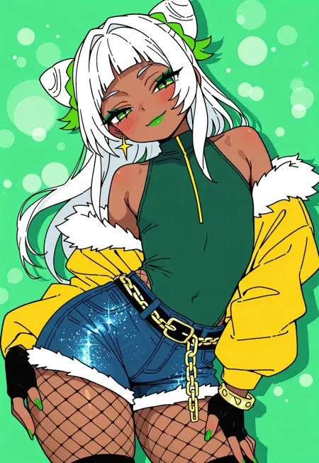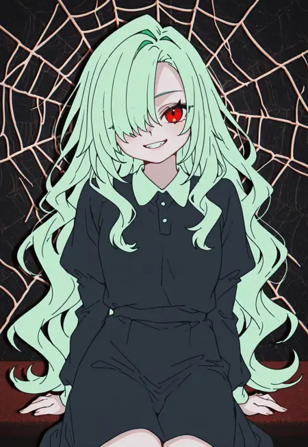 hyno-chan, 绿发, 波浪发, 极长发, 红色眼睛, 发丝遮住一只眼睛, 黑色带领子连衣裙, 长袖, 蓬松袖子,