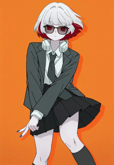 k-chan, 白发, 苍白肤色, 贝雷式短发, 红色内发, 红色眼睛, 白色瞳孔, 齐刘海, 平直发尾, 蓝色指甲,