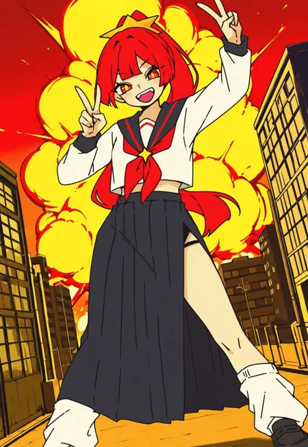 vic_outfit, 星形瞳孔, 马尾辫, 女仆装, 校服, 水手领, 红色领结, 白色衬衫, 长袖, 露腰, 长裙, 黑色百褶裙, 侧开衩, 头饰, 白色松垮袜子, 黑色鞋履,