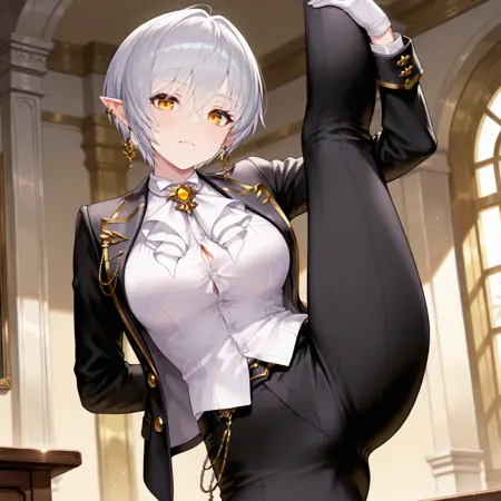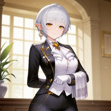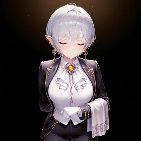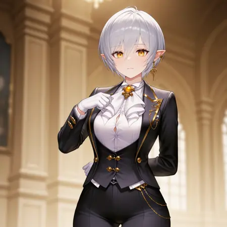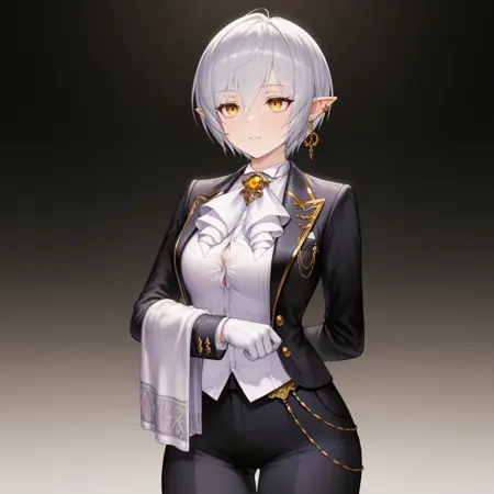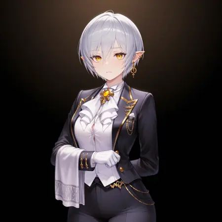 執事、フォーマル、手袋、白手袋、シャツ、ズボン、黒ズボン、白シャツ、開いた服、開いたジャケット、ジャケット、黒ジャケット、アスコット、白アスコット、ブローチ、長い袖、衿付きシャツ、ゴールドのトリム、ボタンの隙間