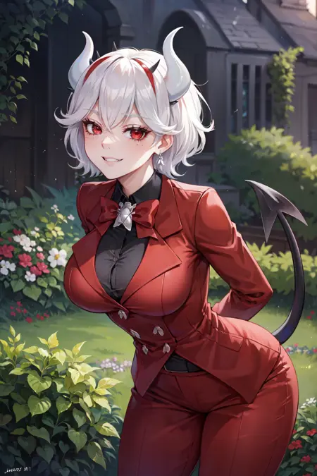 beelzebub, horns, demon girl, short hair, demon horns, white horns, earrings, gloves, shirt, freckles, demon tail, tail, red gloves, formal, medium breasts, suit, bow, jacket, red jacket