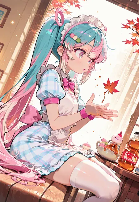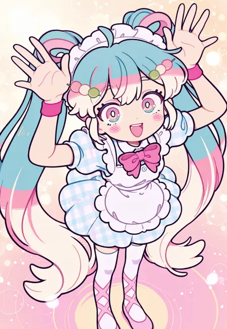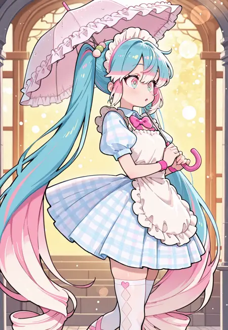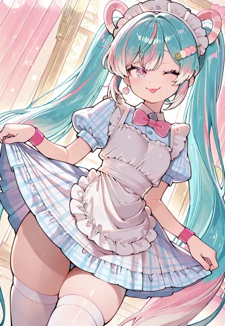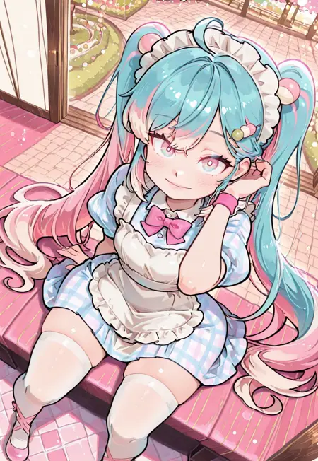 maid headdress,pink bow,bowtie,white apron,light blue dress,plaid dress,puffy sleeves,short sleeves,pink wristband,white thighhighs,pink ballet slippers,