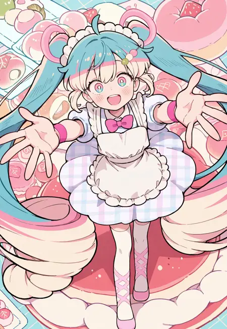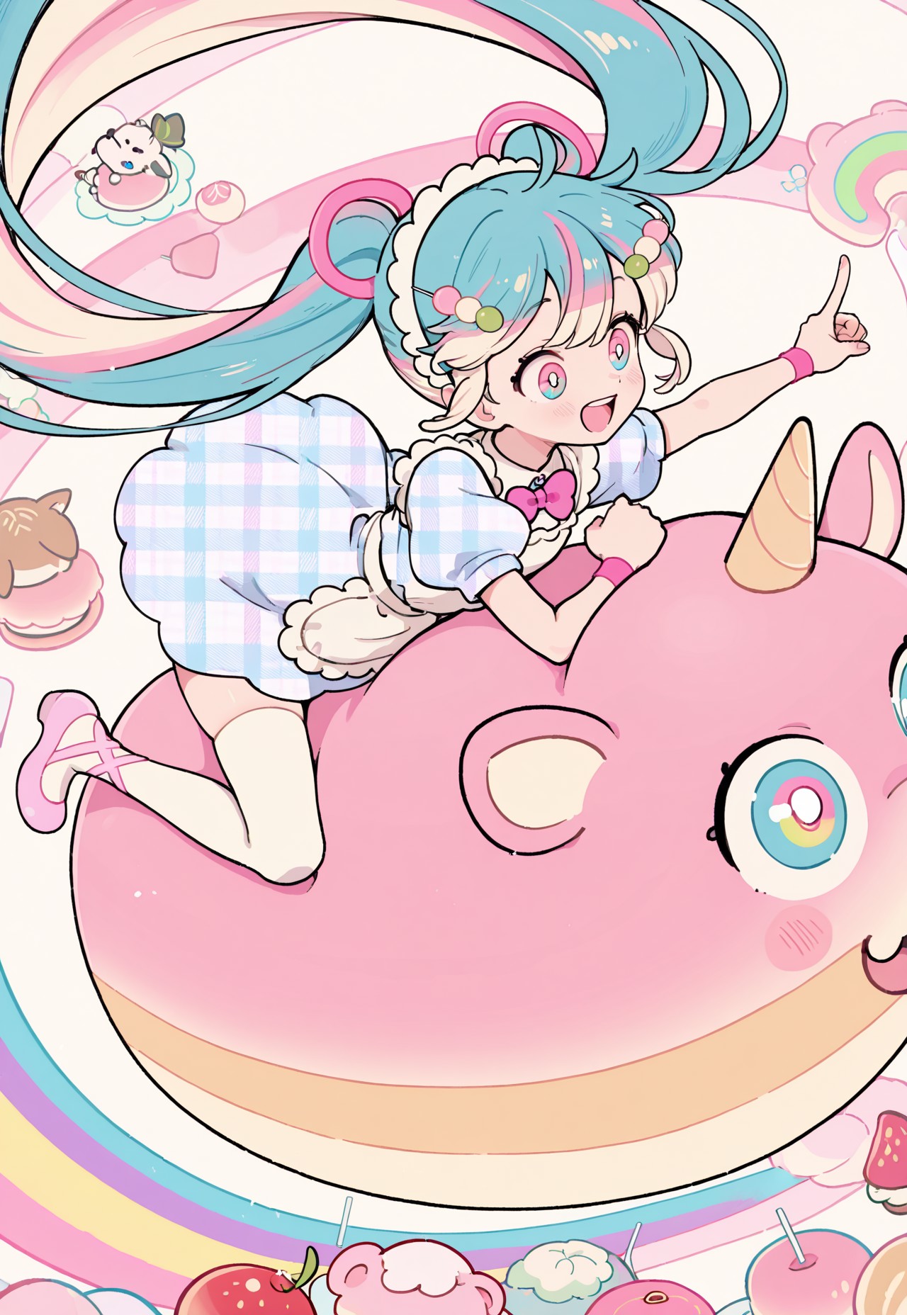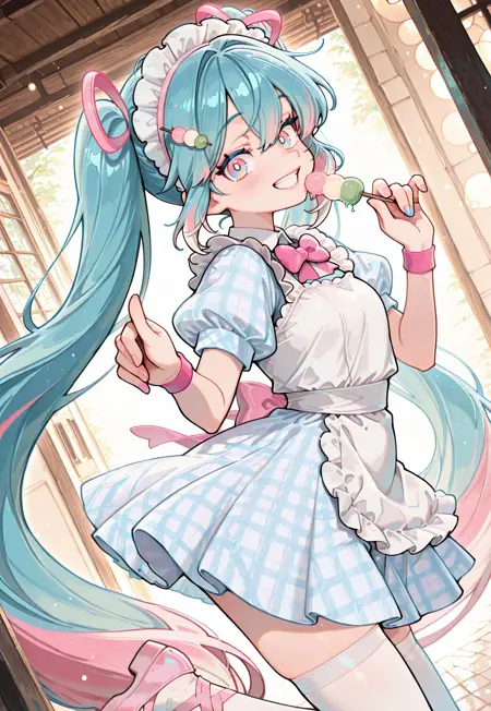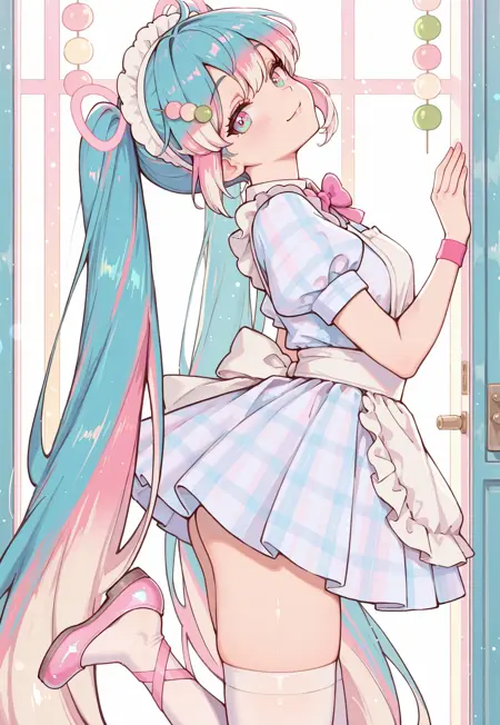 mmochi_miku,blue hair,white tips,pink hair,multicolored hair,twintails,absurdly_long_hair,dango,food-themed hair ornament,blue eyes,pink eyes,multicolored eyes,