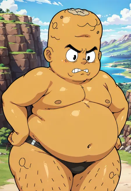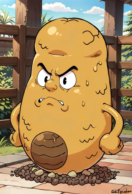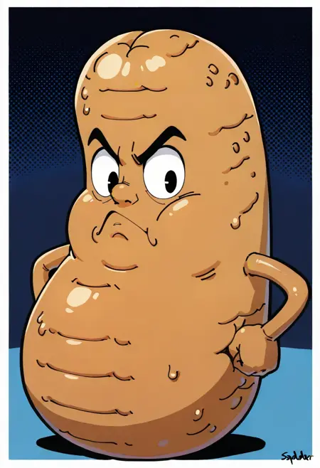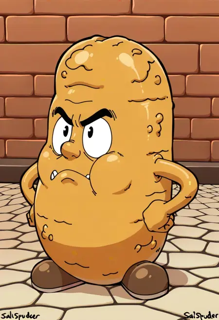 SalSpudder, 1boy, anthropomorphic potato, wide black eyes, fat, chubby, large,