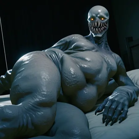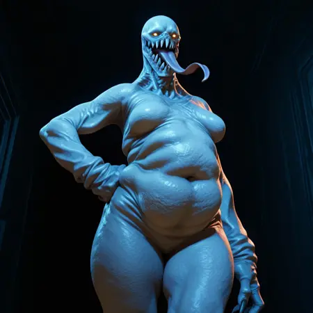 タグ:リジェネレーター、モンスター、灰色の肌、たるんだ、太り気味、静脈が浮き出ている、鋭い歯、歯茎が露出、オレンジ色の目、輝く目、くぼんだ目、長い腕、長い脚、大きな手、爪、大きなお腹、大きなお尻、太ももが太い、モオス、へそ
