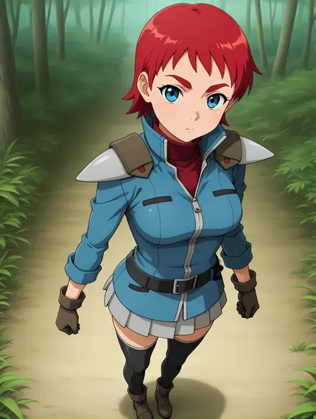 军装蓝色夹克、红色连帽衫、红色高领毛衣、肩垫、灰色短裙、黑色腰带、棕色手套、黑色过膝长筒袜