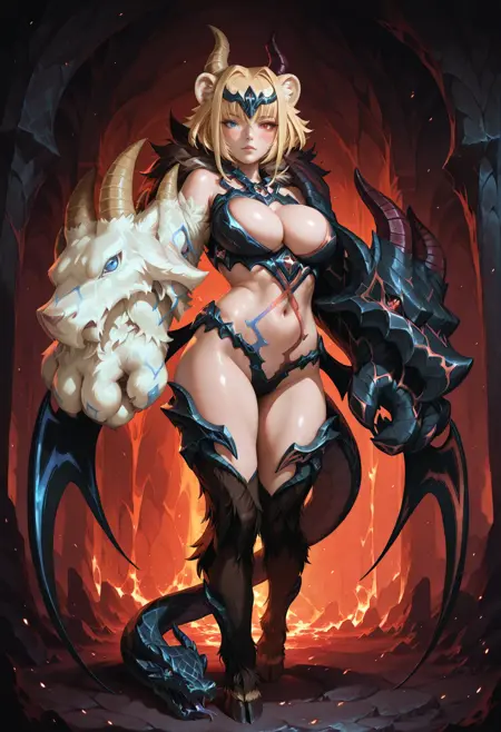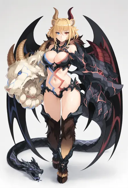 chimaeramge, monster girl, dragon horns, multicolored horns, mane, claws, animal hands, lion ears, oversized arms, oversized hands, white fur, black scales, asymmetrical body, low wings, multicolored wings, snake head tail, white goat head armguard, black dragon head armguard