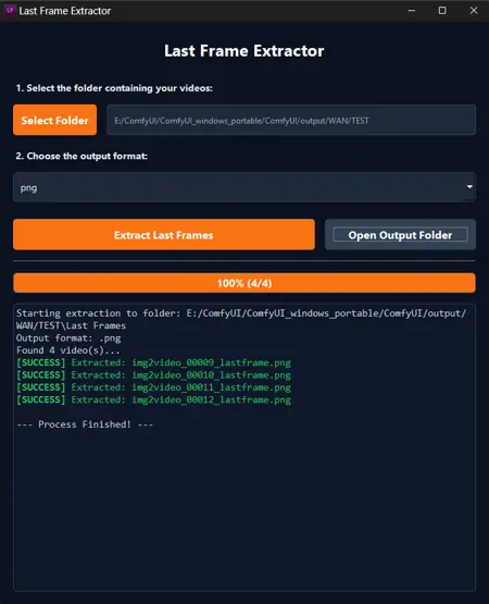 정리된 출력: 애플리케이션은 소스 디렉토리 내에 자동으로 “Last Frames”라는 하위 폴더를 생성하여 추출된 이미지를 저장합니다. 이로 인해 프로젝트 파일이 정리됩니다.