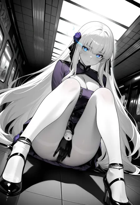 옵션 의상 태그2: diertao, 파란 눈, 발목 장식, 가슴, 유방 간격, 옷 잘린 부분, 검은 장갑, 머리 꽃, 검은 하이힐, 큰 가슴, 스트랩 하이힐, 허벅지 밴드 팬티스타킹, 보라색 유니폼, 흰 장갑, 흰 팬티스타킹, 치마 없음,
