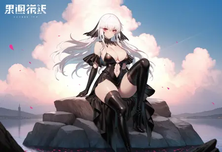 옵션 의상 태그1: diyitao, 빨간 눈, 검은 드레스, 검은 부츠, 가슴, 유방 간격, 검은 팔꿈치 장갑, 하이힐 부츠, 큰 가슴, 배꼽, 검은 베일,