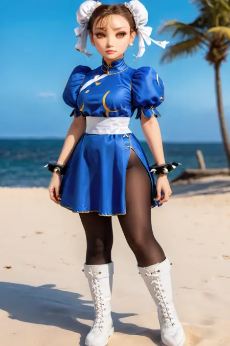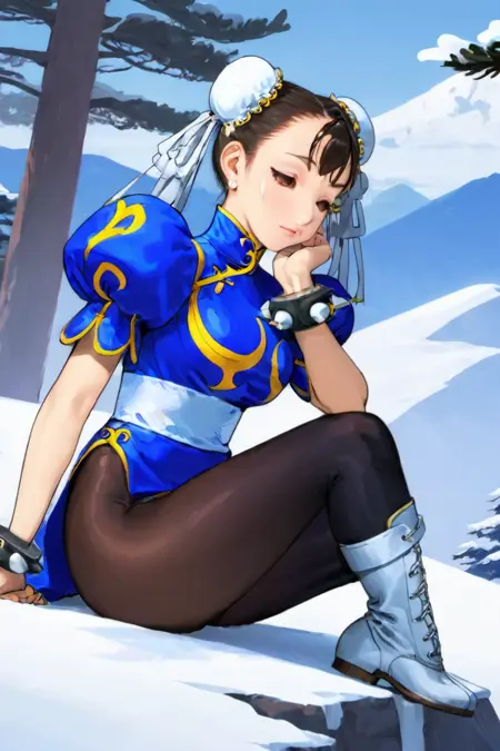 trigger-words: SF2CL, hair buns, covered buns, chinese dress, qipao, blue outfit, spiked bracelets, puffy sleeves, brown pantyhose/leggings/stockings, white belt, white boots