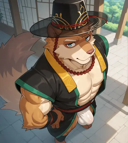 muscular, bara, blue eyes, brow tail, brown eyeshadow服装提示词: