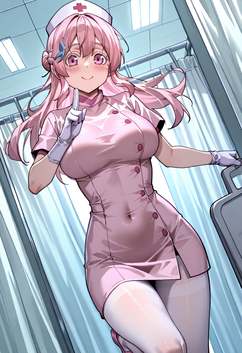 看護師、ピンクのドレス、看護師帽、白い手袋、白いパンスト、ピンクの靴、ヘアクリップ、ヘアオーナメント、聴診器、