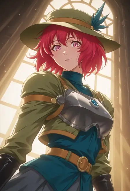 Kyuo Lyu, 1girl, solo, red hair, pink hair, short hair, purple eyes, pink eyes, hat, green hat, hat feather, green jacket, armor, dark cyan blue shirt, bridal gauntlets, polearm, grey skirt, thigh boots,