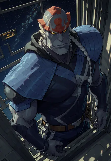 | 학습된 단어 | blue shoulder pads, muscular, red forehead design, white clothes accents, 2 toes, yellow sclera, black arm guards, black armored pants, black hood, grey skin, Kolivan, no pupils, brown belt, dark eye outline, black clothes, braided pony tail, scar over right eye, front facing, 5 fingers복사됨! |