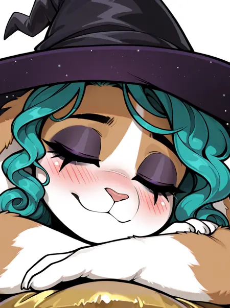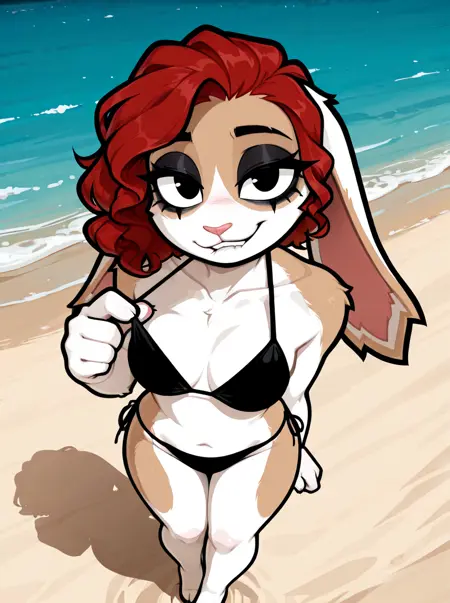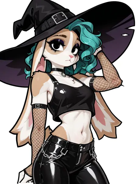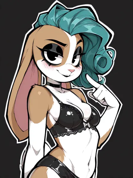 Triggers: anthro, female, lagomorph, floppy ears, black eyes, curly hair, cyan hair, mascara, eyeshadow, tan fur, white fur, multicolored fur