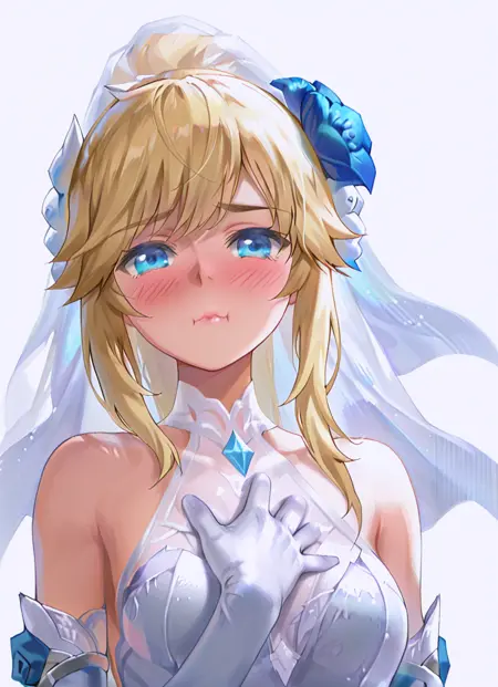 blonde hair, blue eyes, ponytail, long locks, medium breasts, hair ornament, blue hair flower, bridal veil, bare shoulders, sleeveless, backless dress, white dress, wedding dress, elbow gloves, thighhighs, high heels,