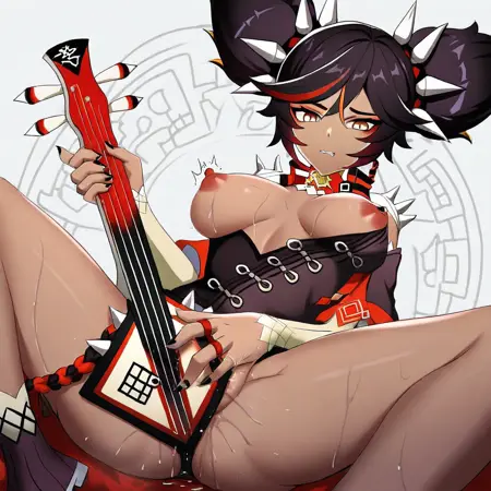 (Genshin_Xinyan, 다색 머리카락, 줄무늬 머리카락, 검은 머리카락, 빨간 머리카락, 트윈테일, 노란 눈, 검은 피부 여자, 검은 손톱, 중국 복장, 스파이크, 기타),