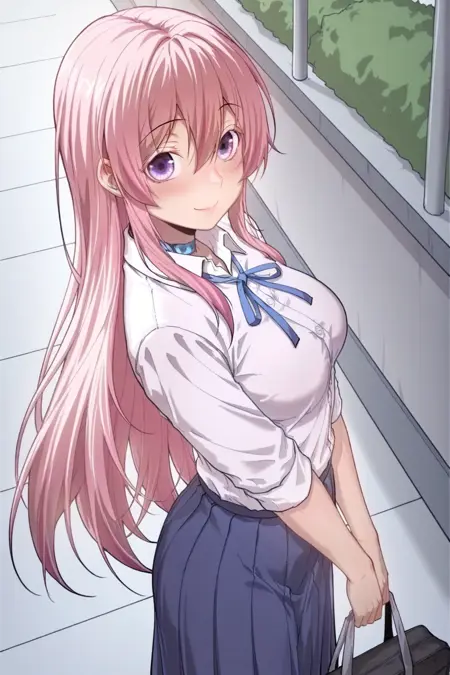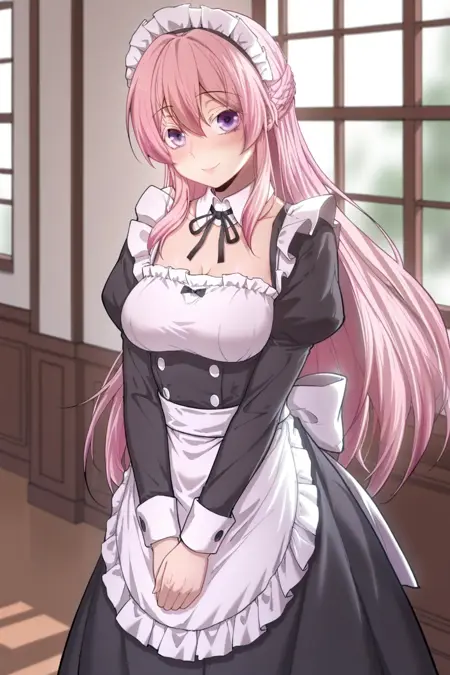 プロンプト:masterpiece, best quality, amazing quality, fine details, Jin Zhiyan, solo, breasts, medium breasts, long hair, pink hair hair between eyes, braid, french braid, hair bun, purple eyes,
