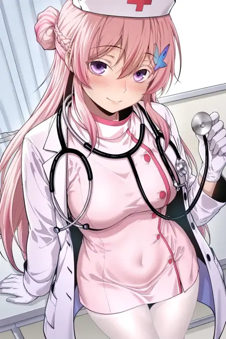 ナース衣装:hair ornament, hairclip, nurse, hat, nurse cap, stethoscope, dress, pink dress, coat, gloves, white gloves, pantyhose, white pantyhose,