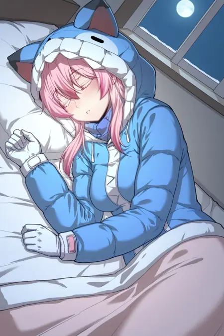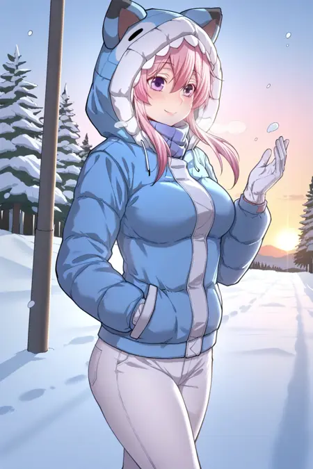 冬服衣装:winter clothes, blue hood, animal hood, hood up, jacket, long sleeves, gloves, white gloves,