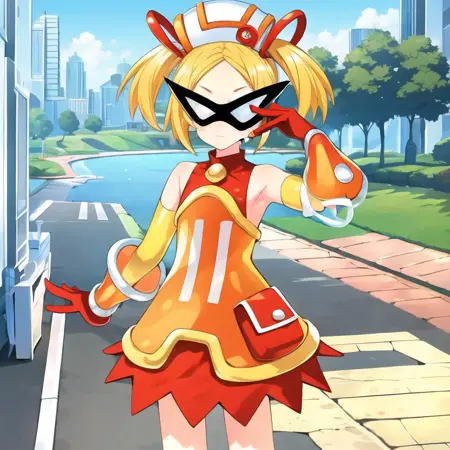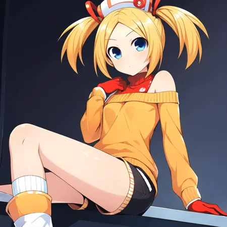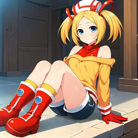 例の完全なプロンプト: ソロ、1girl、Bsha、短髪、青い目、金色の髪、短いツインテール、グローブ、帽子、肩出し、ブーツ、靴下、ドレス