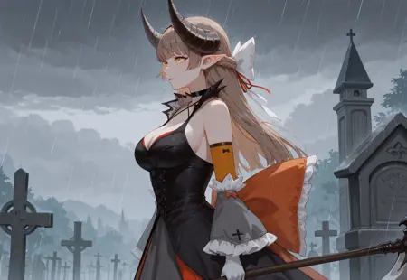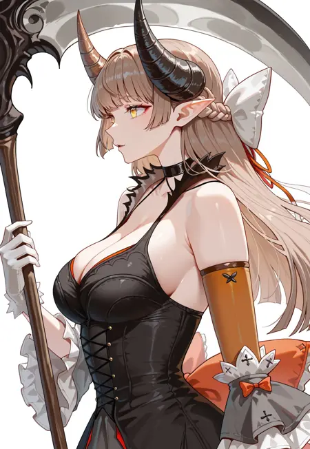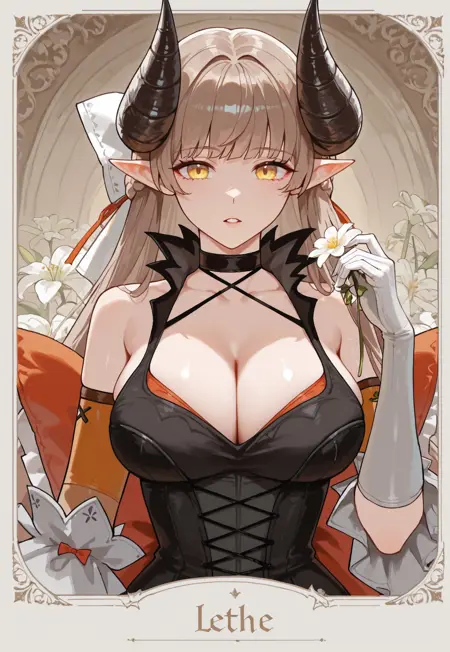 ドレス、濃いグレーのドレス、黒い角、フリル付きの袖、前髪、茶色の髪、リボン、髪の後ろの編み髪、黒いドレス、花、lethe_default、頭の後ろのリボン、十字が付いたドレス、ノースリーブ、取り外し可能な袖、フレア袖、薄茶色の髪、角、オレンジの袖、大きな胸、とがった耳、グレーのストッキング、プラットフォームヒール、ネックライン、リボン編み髪、長い髪、保持、白いリボン、とがった耳、オレンジのライン入りドレス、白いリボン、とがった耳、黄色い目、コルセット、リボン編み髪、カラーのストラップ、不均等な前髪、前髪、白い手袋