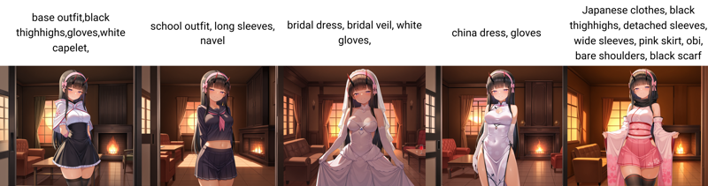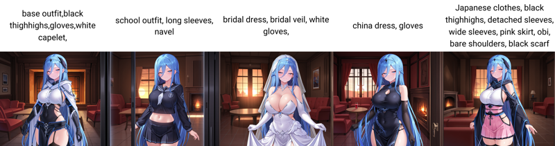 These are examples of the characters and included outfits that you can prompt with this LoRA. Note that base outfit refers to a specific outfit for Yurisia. This started as a character LoRA for her. I forgot to change the name in the dataset before training it, so it is stuck that way for now. I have called out the original outfit for each of the characters below for reference.