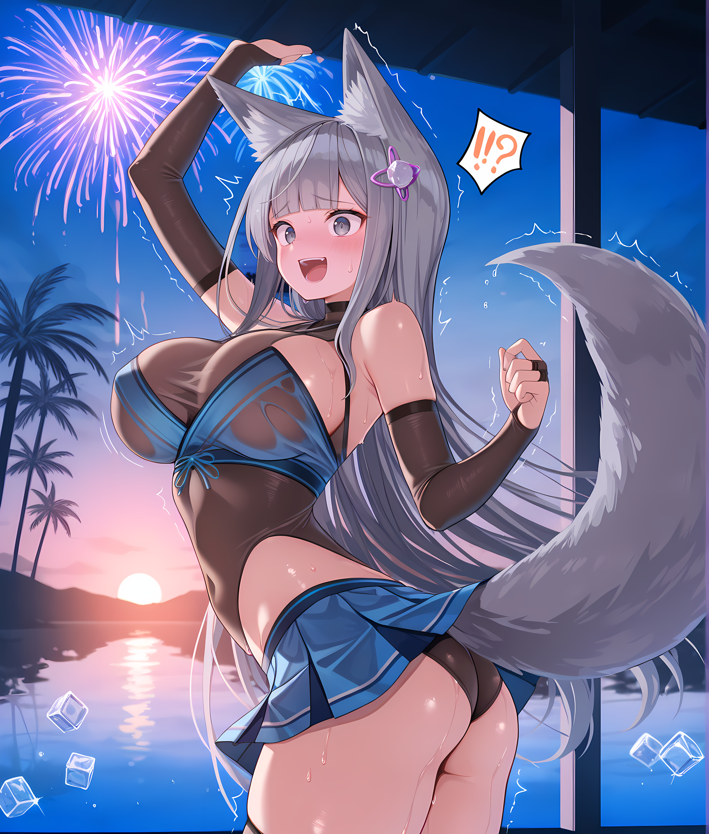 Character: Yurisia, cross earrings, blue eyes, medium breasts, white hair, long hair, hair flower, black hairband,
