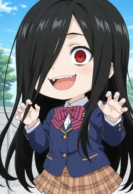 Nao Sadatsuka (normal): long hair, black hair, red eyes, crazy eyes, hair over one eye