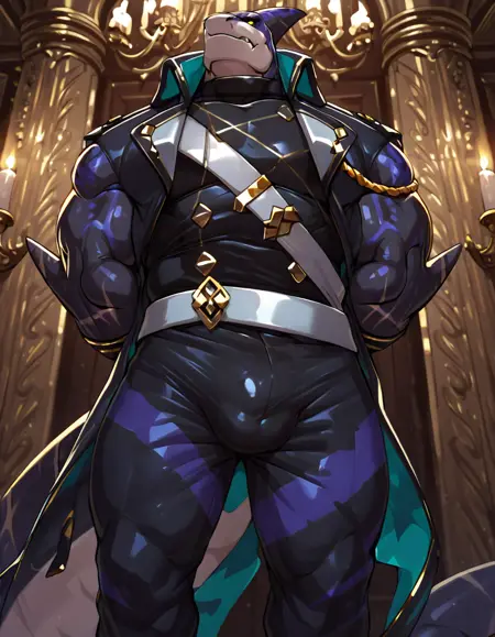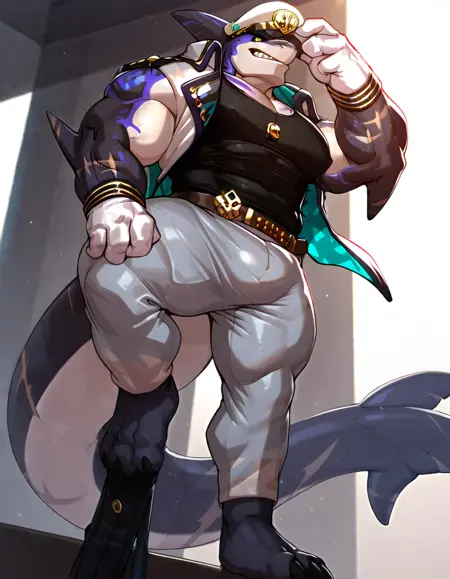 옷: 검은 탱크탑, 내부 주황색 안감, 장식용 벨트, 한쪽 어깨에 줄, 흰색 선장 모자, 노랑색 어깨 줄, 녹색 어깨 드레이프, 회색 넓은 바지,