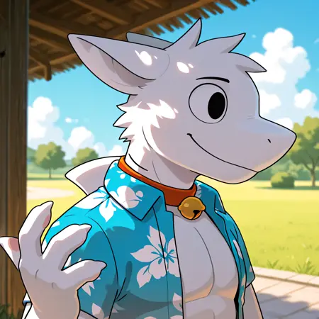 hawaiian shirt, jingle bell, neck bell, furry, furry male, open clothes, collared shirt