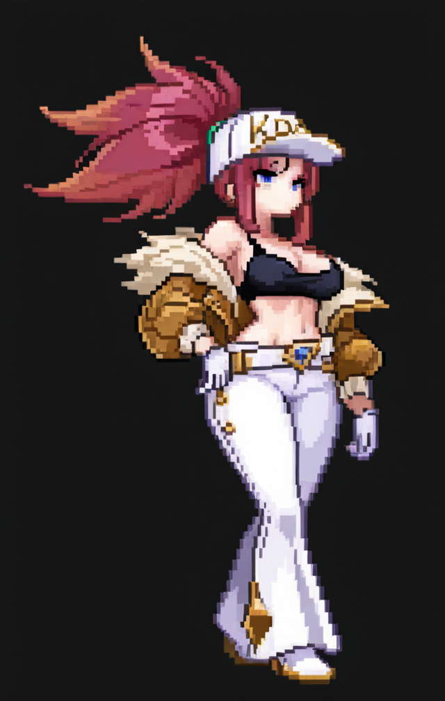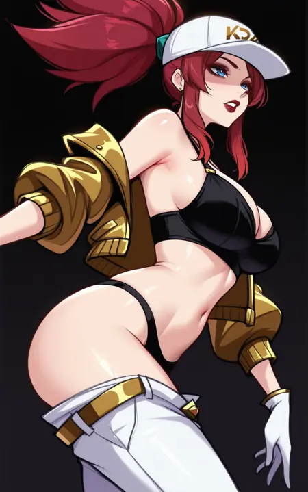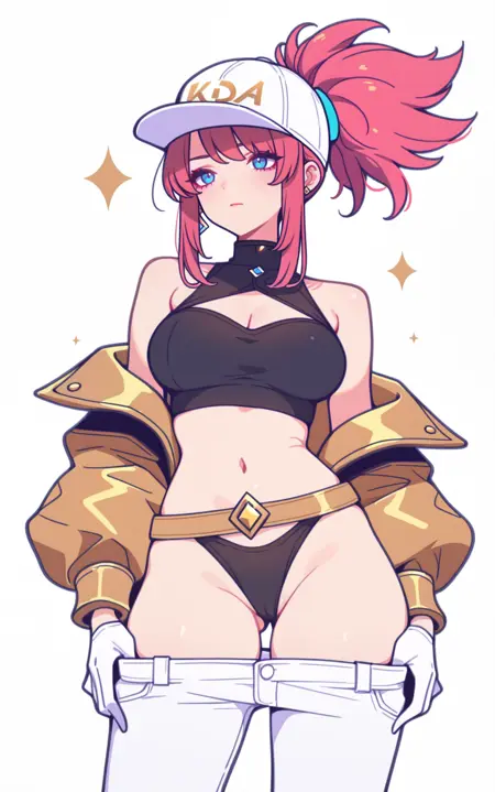 KDA_Akali, red-pink hair, long ponytail, undercut, white cap, blue eyes, makeup, bare shoulders, gold jacket , black bra top, white gloves, white high-waisted pants, gold trim, gold belt, white boots with gold trim,