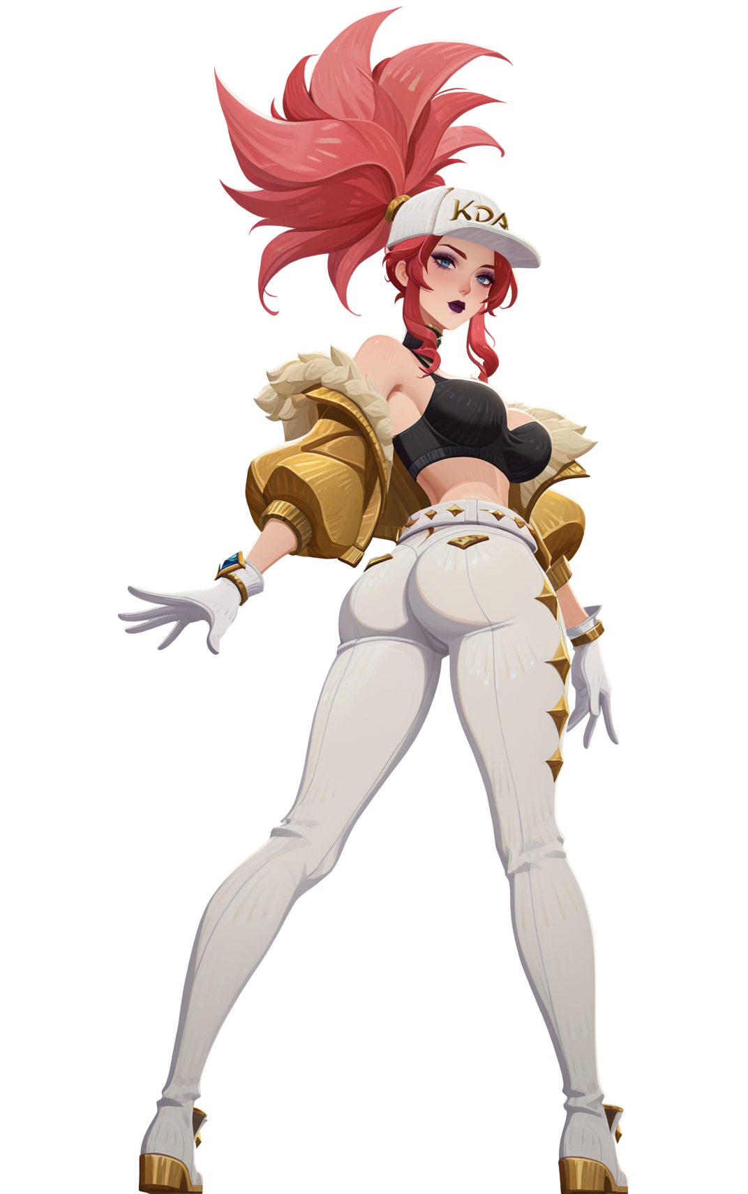 KDA_Akali、赤ピンクの髪、長いポニーテール、アンダーカット、白いキャップ、青い目、メイク、肩出し、ゴールドのジャケット、黒いブラトップ、白い手袋、白いハイウェストパンツ、ゴールドのトリム、ゴールドのベルト、ゴールドのトリム付き白いブーツ