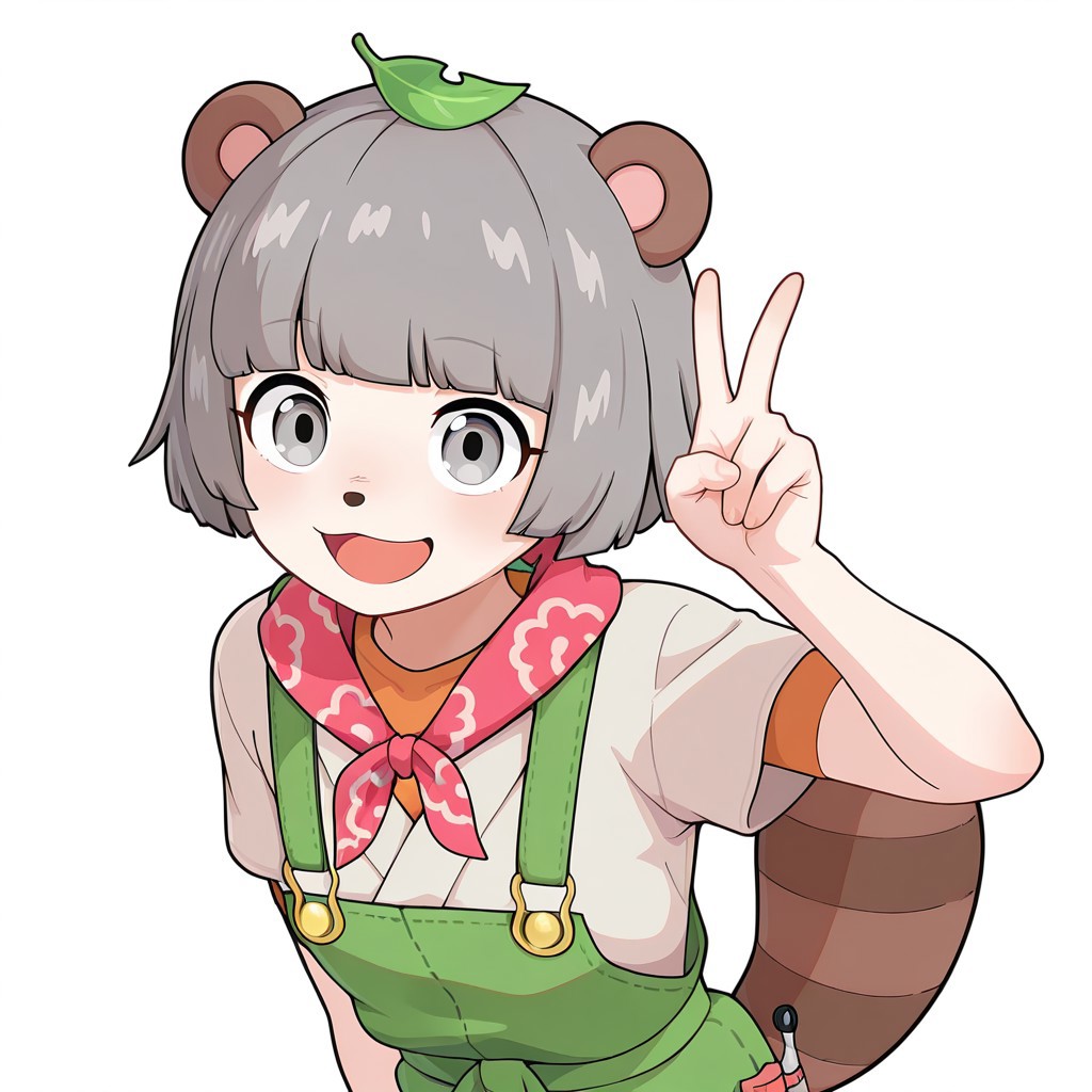 grey eyes, grey hair, short hair, bob cut, blunt bangs, raccoon ears, animal ears, animal nose, leaf on head, overalls, green overalls, short sleeves, layered clothes, white shirt, orange shirt, japanese clothes, neckerchief, red neckerchief,