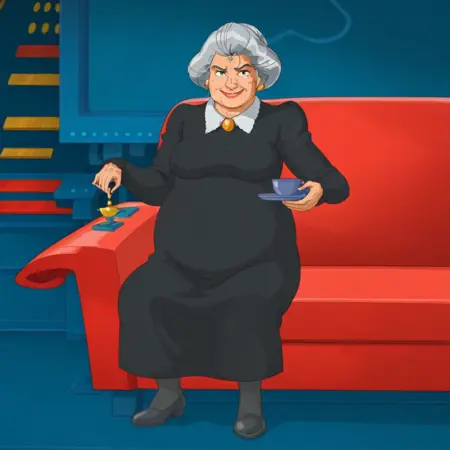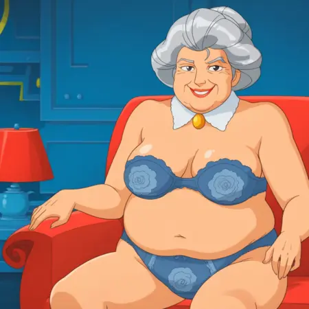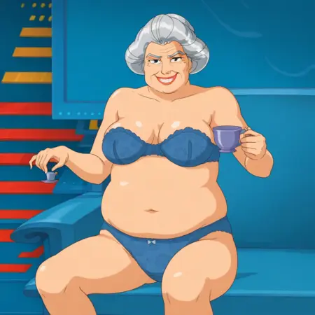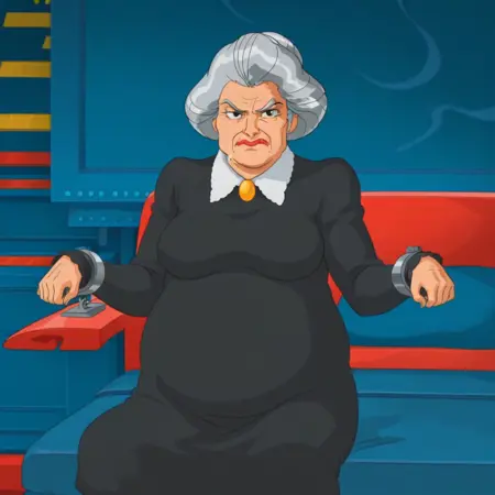 Quivers_Totally_Spies, 1Woman, Solo, Elderly Woman, 63 Years Old, Large breasts, Fat, Black Eyes, Gray Eyebrows, Gray Hair, Short Hair, Hair Bun, Pink Lipstick Charcoal Collared Dress, Single Gold Button to the Collar, Long Sleeves, Pearl Earrings, Gray Pantyhose, Charcoal Mary Jane Shoes