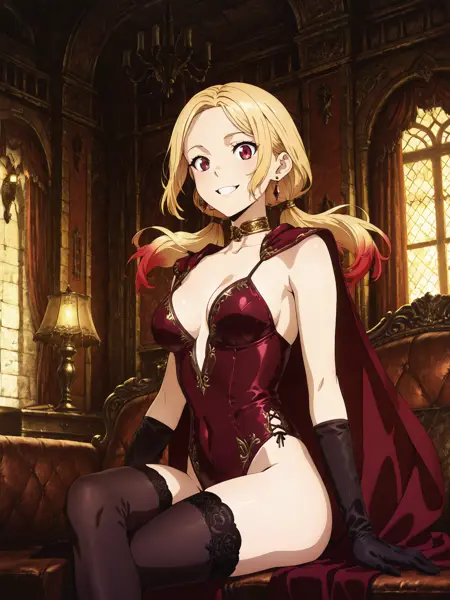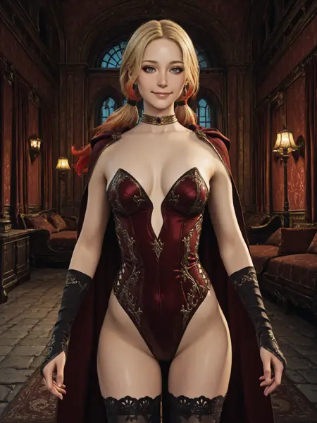 red leotard, black gloves, neck accessory, red cape, wizard, gold trim, black lace-trimmed thighhighs