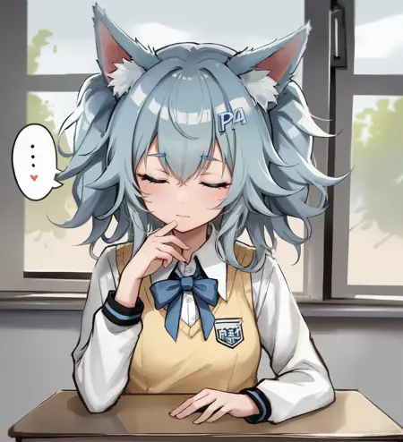 <lora:PA15School:1>,1girl,PA15School,blue hair,messy hair,blue eyes,yellow vest,white shirt,blue bowtie,twintails,fox ears,fox tail,hair ornament,plaid skirt,thigh strap,white thighhighs,