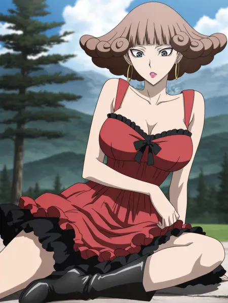 IL_尾崎京子,(单独),(1个女孩),卷发,蓝眼睛,棕色头发,短发,胸部,大胸部,露乳,妆容,口红,珠宝,耳环,圆环耳环