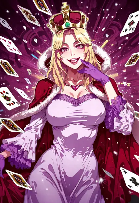 1. (华丽的红金王冠,配祖母绿胸针,褶边白色长裙,紫色手套,红色披风,白色毛边装饰心形吊坠,)金色宝石手镯,紫色长筒袜,