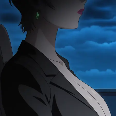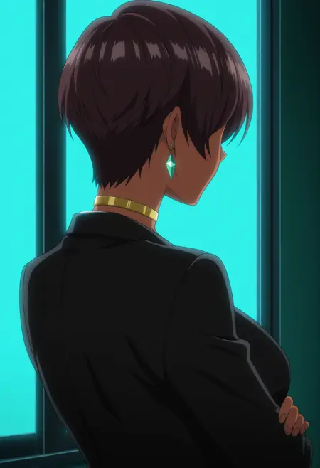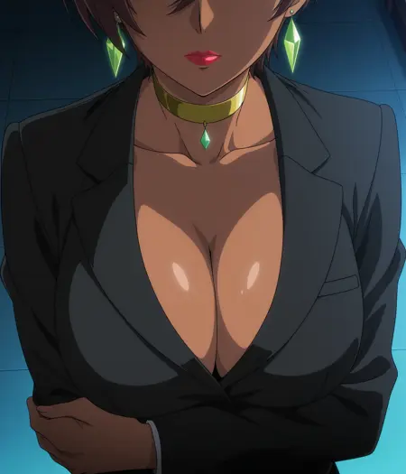 提示词:1girl, solo, mature female, milf, brown hair, short hair, pixie cut, large breasts, dark-skinned female, hidden eyes, no eyes, faceless, shaded face, no eyebrows, earrings, green diamond earrings, choker, golden choker, lipstick, black blazer, pencil skirt, high heels,